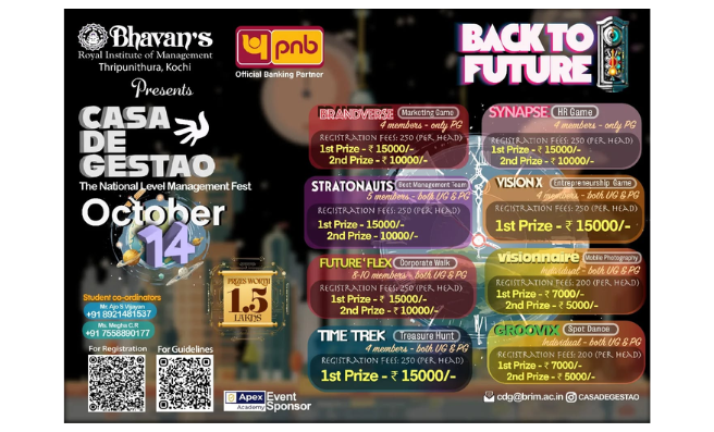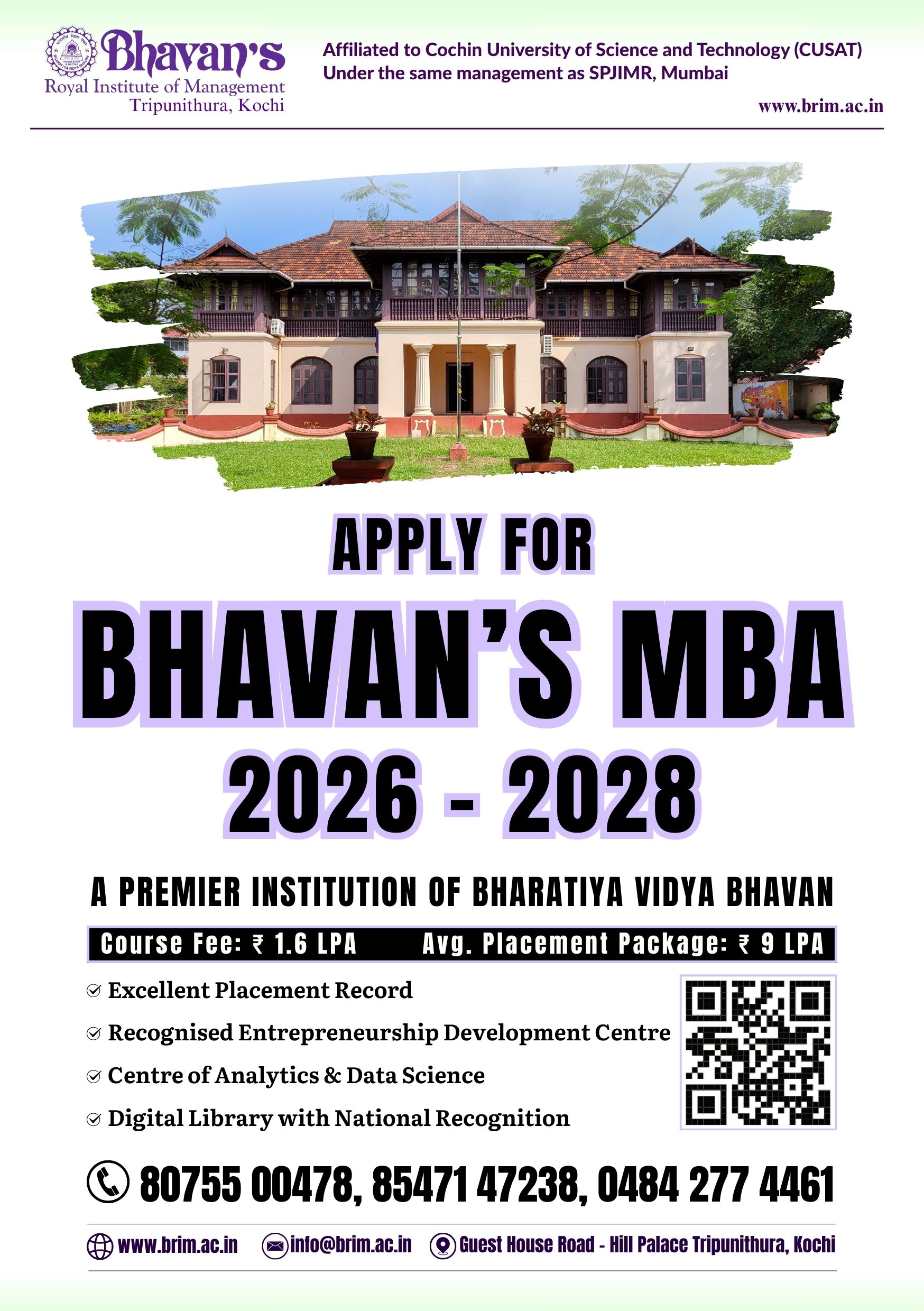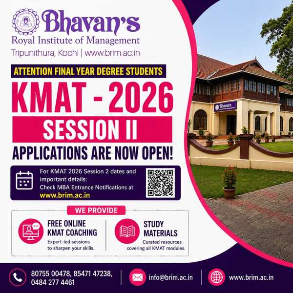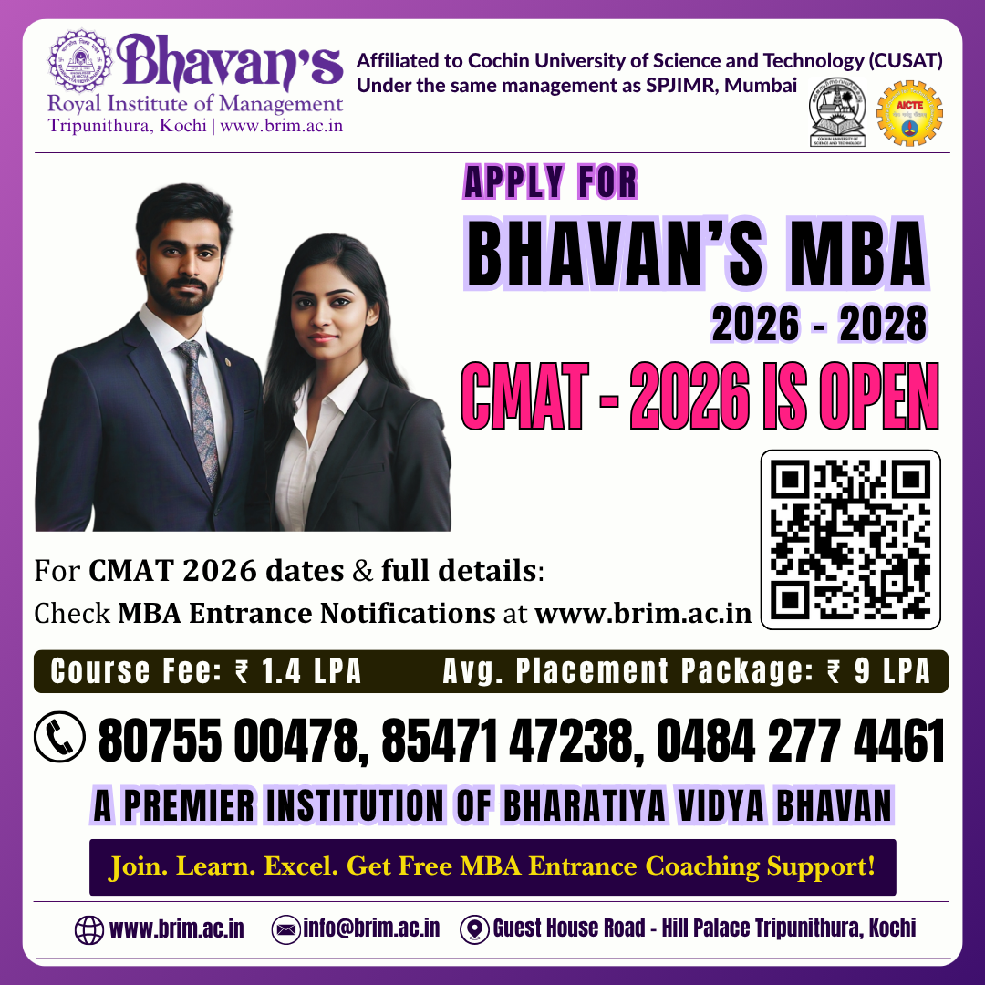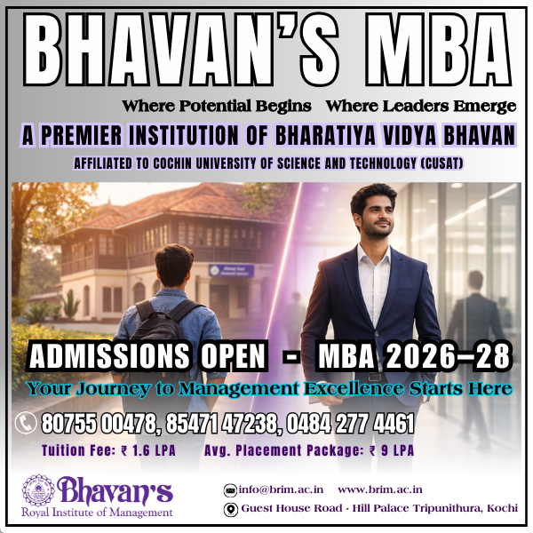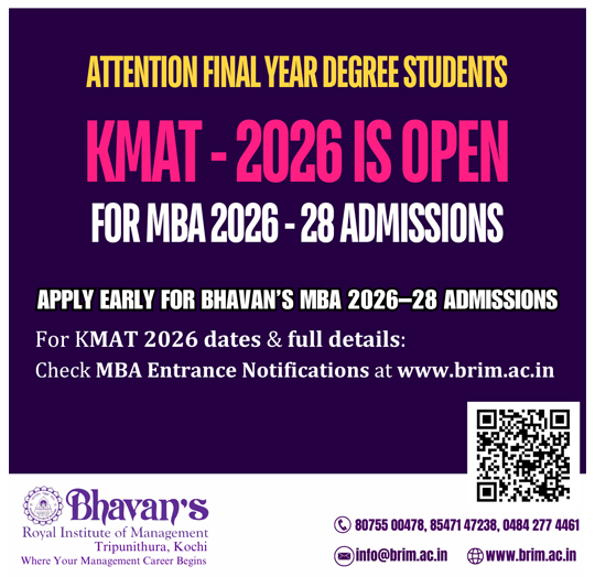 The Bharatiya Vidya Bhavan is India's premier non governmental, apolitical, secular, national movement with an international outlook devoted to life-related education, literature and culture. Bhavan's Royal Institute of Management (Bhavan’s B-School), promoted by the Kochi Kendra of the Bharatiya Vidya Bhavan, brings to you MBA education of the best quality at international standards.