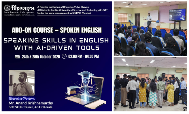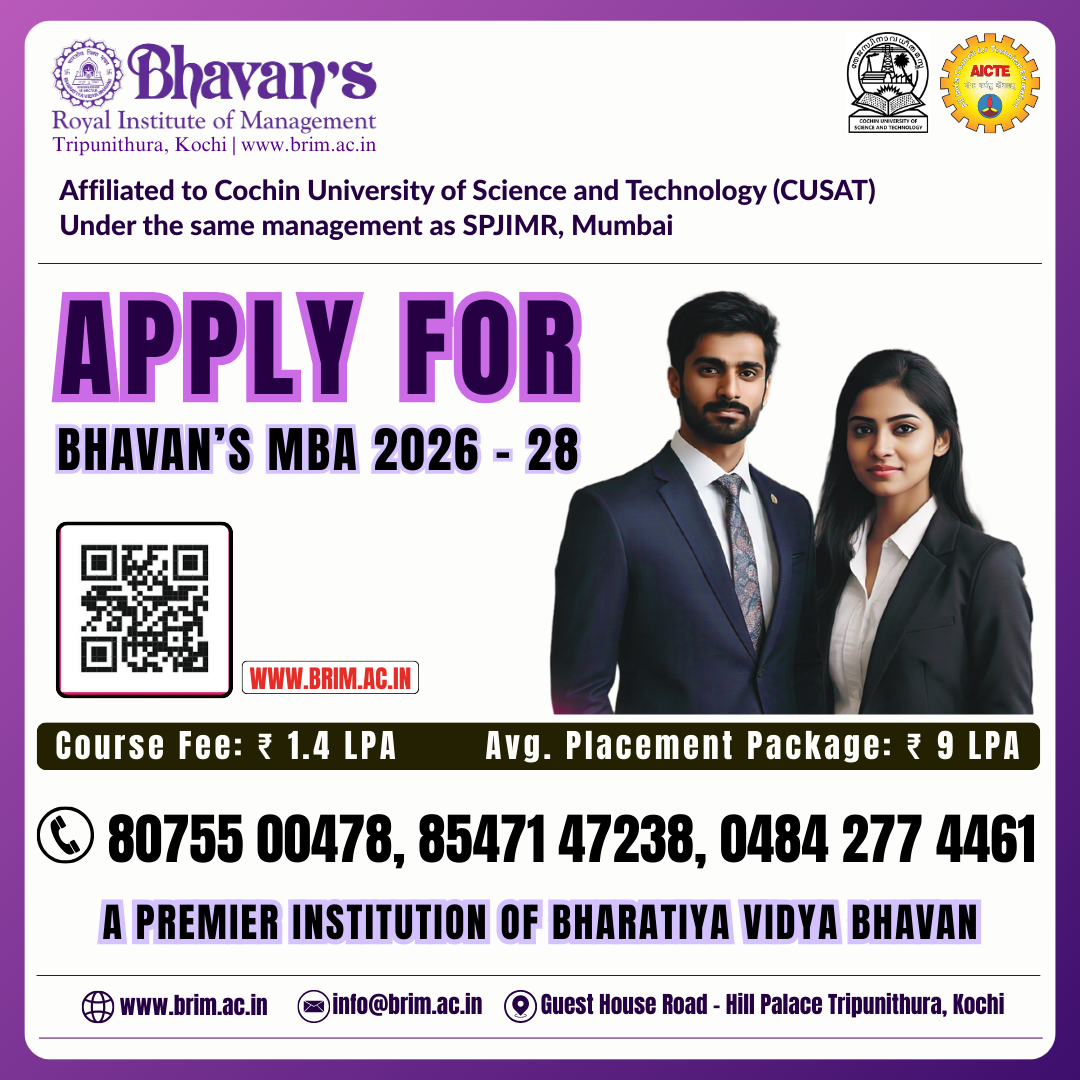 The Bharatiya Vidya Bhavan is India's premier non governmental, apolitical, secular, national movement with an international outlook devoted to life-related education, literature and culture. Bhavan's Royal Institute of Management (Bhavan’s B-School), promoted by the Kochi Kendra of the Bharatiya Vidya Bhavan, brings to you MBA education of the best quality at international standards.